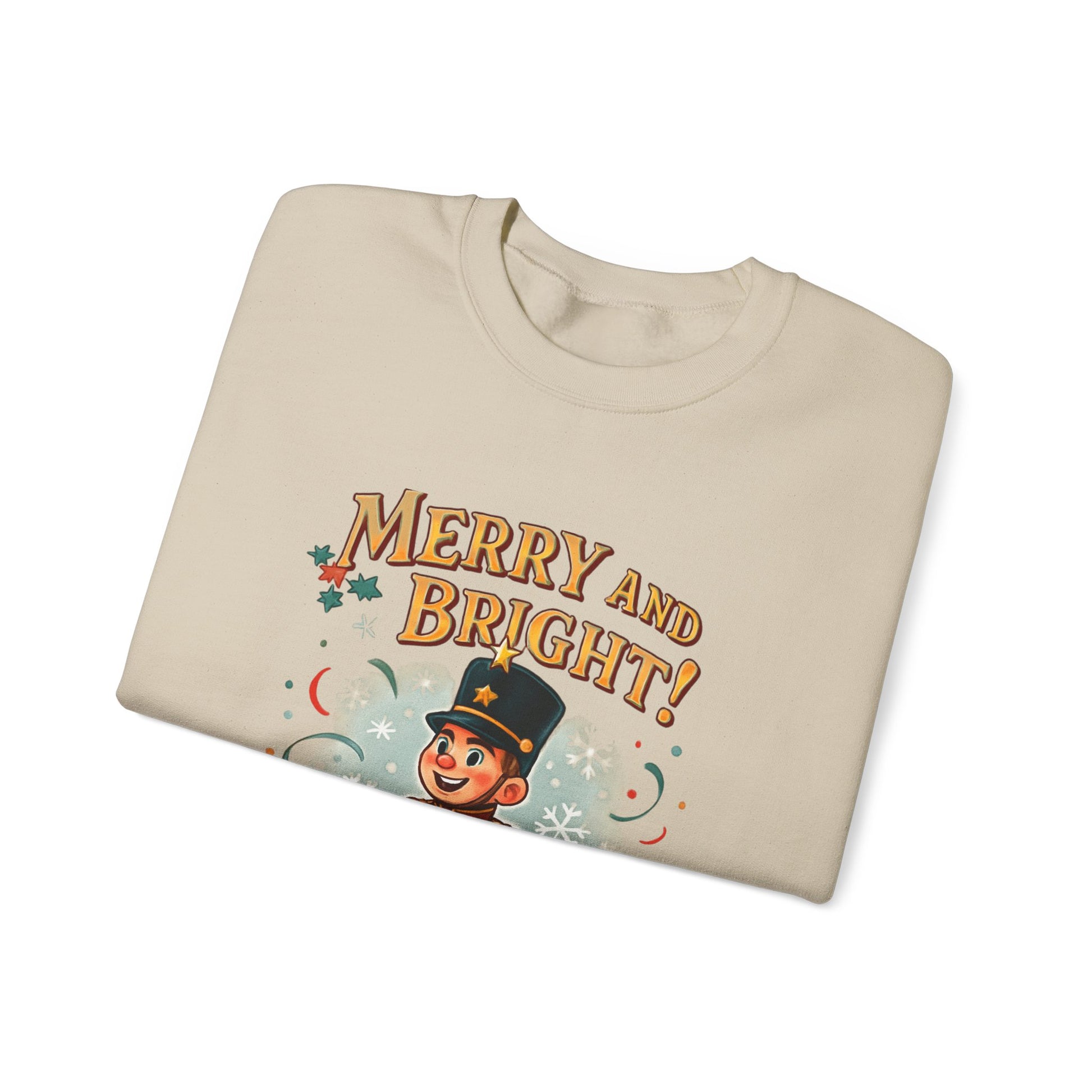 A cozy crewneck sweatshirt that brings a touch of vintage holiday cheer to slow mornings and festive hangs. The soft, medium-heavy cotton-poly blend feels warm without weighing you down, while the classic fit and ribbed collar hold their shape through seasons of wear. The front features a cheerful nutcracker illustration framed by the lettering “Merry and Bright!”—a playful nod to old-school holiday cards and tree-top pageantry. Wear it while wrapping gifts, sipping cocoa by twinkling lights, or strolling through a winter market. Stitched details and durable seams mean it stands up to repeated wears, and eco-conscious dyes and responsibly sourced cotton make it a thoughtful choice for those who care about how their clothes are made. Product features - Medium-heavy 50/50 cotton-poly blend (8.0 oz/yd²) for warmth and durability - Classic crewneck with ribbed knit collar that retains shape - Tubular, seamless body for a clean look and reduced fabric waste - Double-needle stitching at shoulder, neck, waistband and cuffs for long-lasting wear - Embroidered or printed placement options; OEKO-TEX dyes and US cotton sourcing Care instructions - Machine wash: cold (max 30C or 90F) - Non-chlorine: bleach as needed - Tumble dry: low heat - Do not iron - Do not dryclean